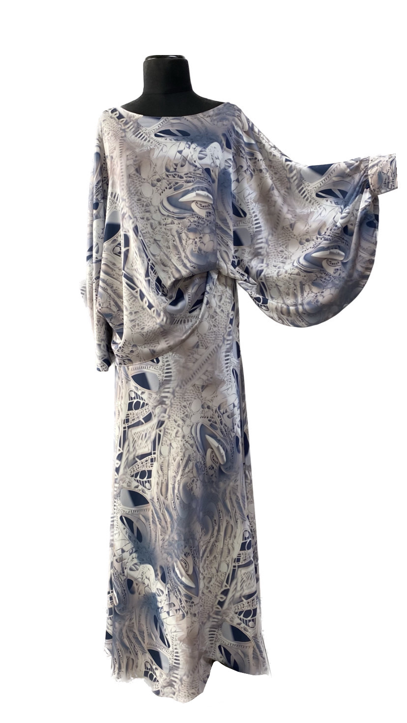 Conjunta Blusa y Falda en seda estampada, diseñada con inteligencia artificial. La blusa tiene cuello amplio, mangas con volumen y puños. Los botones son hechos a mano en resina epóxica.