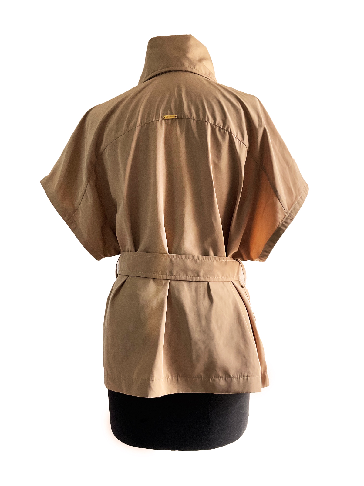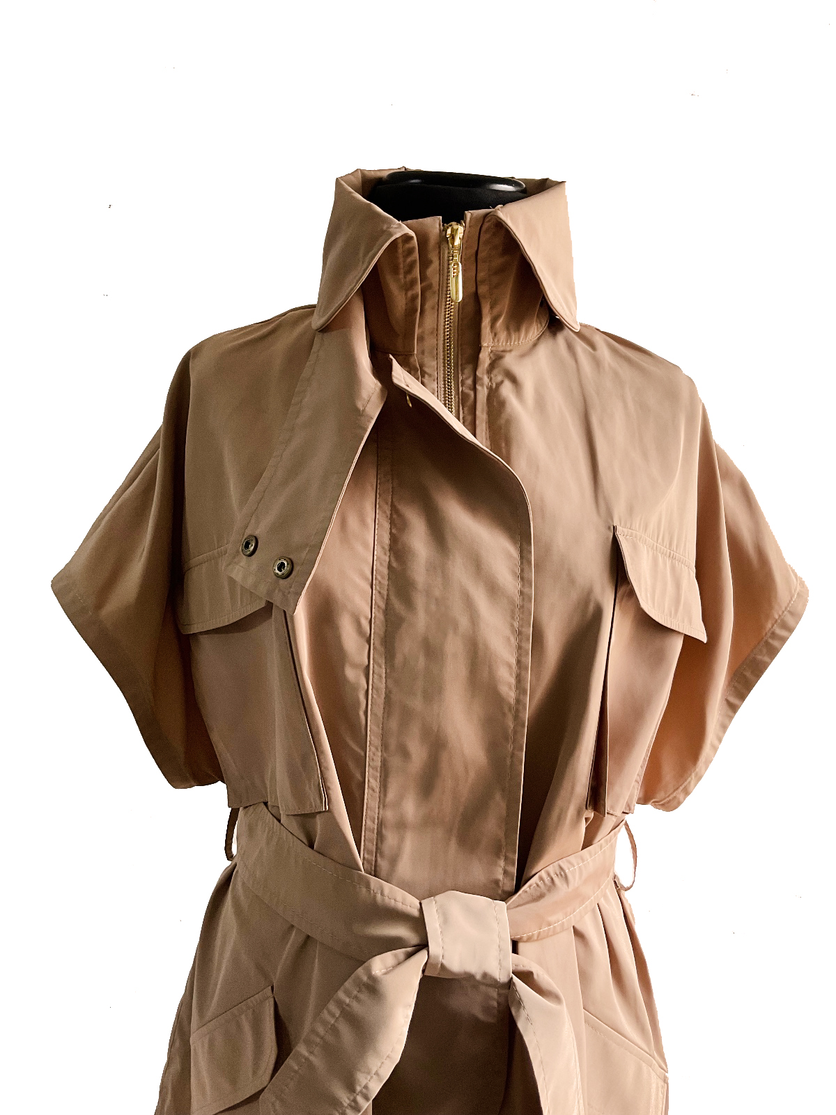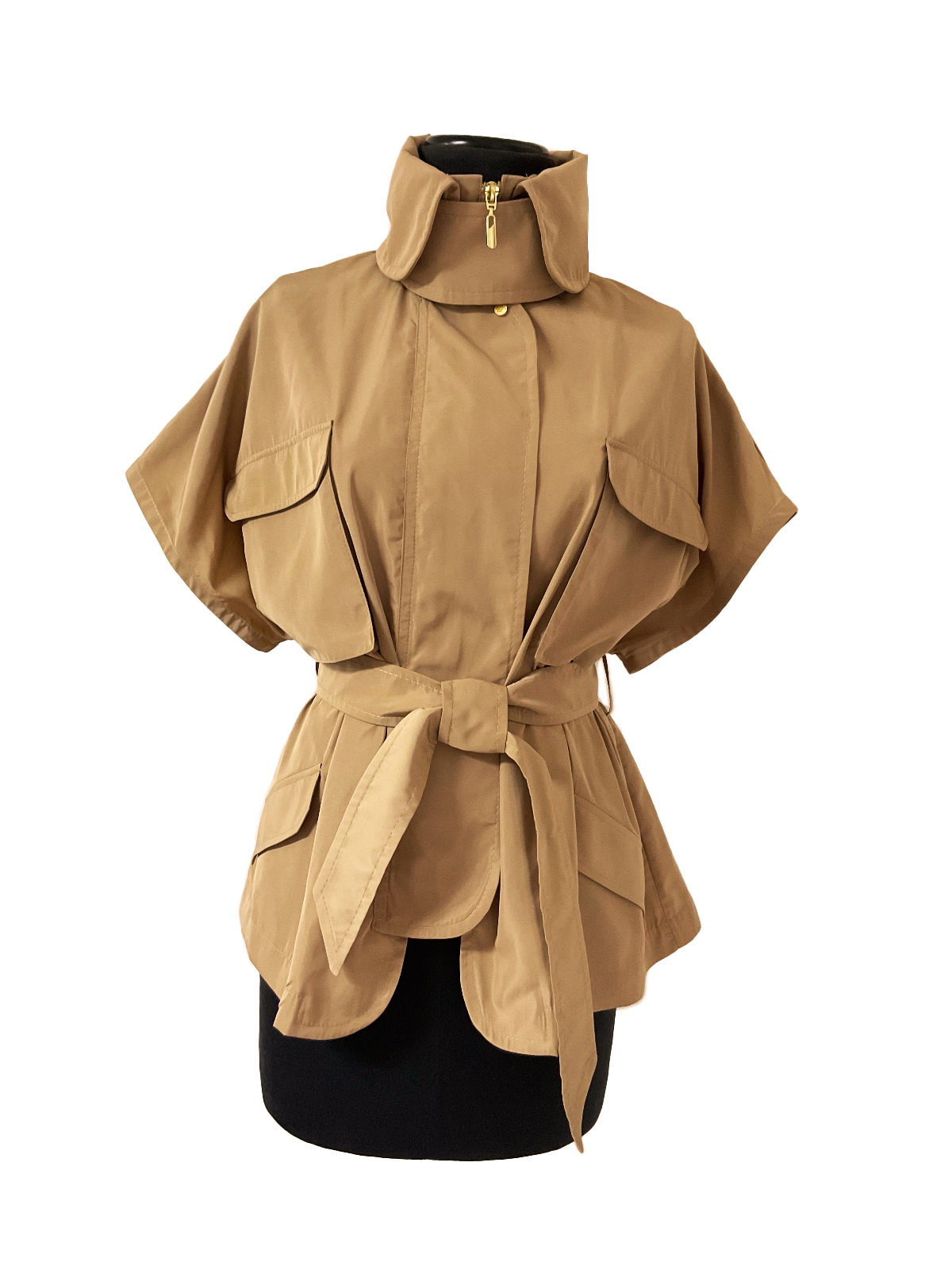 Chaqueta camel en antifluido tipo gabardina, manga corta, cuello alto, sistema de cierre cremallera dorada, el pie de cuello cuenta con broches a presión, bolsillos de parche camuflados y cuenta con cinturón de ajuste en el mismo material y color.